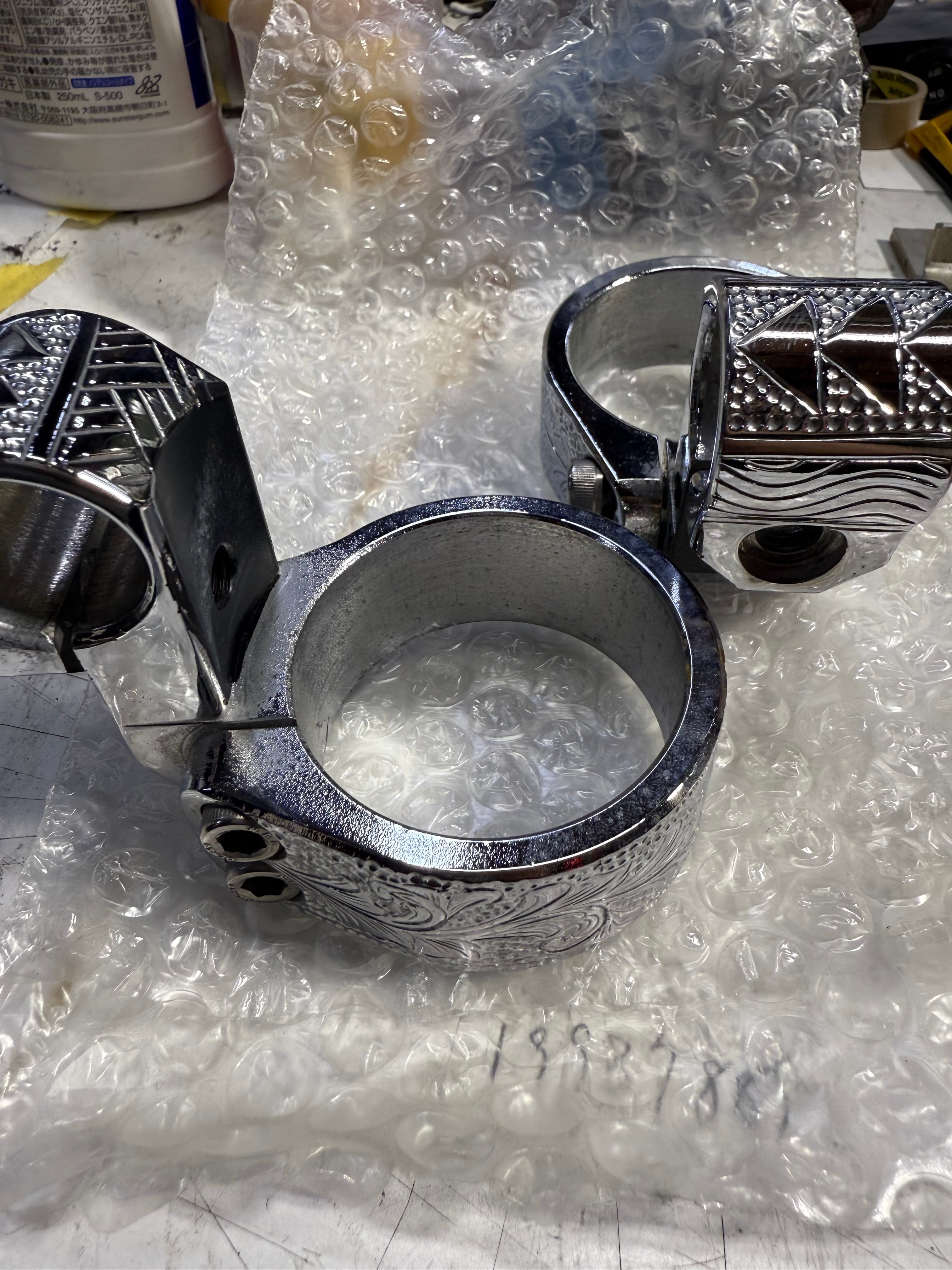 エングレとメッキを追加で加工した中古品になります!基本ほとんど使ってませんが、取付けはしたのでフォークのパイ数は50パイです!ハンドルバーは標準です